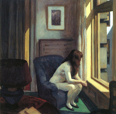 Atraem-me os rostos do silêncio, habitantes urbanos de espaços fechados, na vã procura de um sinal que uma  janela virtualmente pode propiciar, embora esta mulher de Edward Hopper pressinta no seu íntimo que a fronteira é inexpugnável. O seu corpo nu parece aqui acentuar a vulnerabilidade daqueles que se sabem sulcados pela morte do desejo, por isso funciona como uma metáfora da desolação. O rosto está colocado de molde a esconder-se ao nosso olhar e os longos cabelos escuros, a contrastar com o marmóreo da pele, prolongam este indizível sentimento de ausência e clausura. O corpo torna-se então um objecto que faz a transição entre a escuridade dos móveis e a ilusória luz exterior. A postura é de expectativa, mas sem convicção, legível na pose das mãos. Os pés paradoxalmente calçados deixam pressentir uma eventual saída futura, mas em frente o seu olhar depara-se com as paredes dos prédios fronteiros, num significante bloqueamento. Nesta pintura o nu feminino perde qualquer dimensão erótica, pois o corpo coisifica-se nesta espera absurda. Quem poderá esperar? O amante infiel que a esqueceu definitivamente? O inviável anjo libertador? De qualquer modo, tanto a janela como o quadro suspenso na parede são meros simulacros de abertura ao exterior: a solidão é irreversível neste "Eleven A. M.".